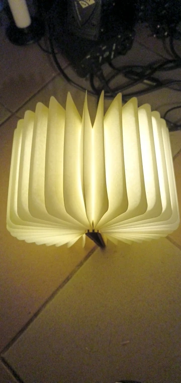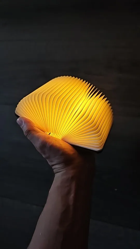 A compact foldable lamp designed to provide warm ambient lighting through a portable, book-inspired structure.