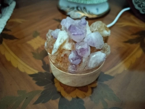 The Crystal Glow Lamp is an ambient lighting piece built with natural crystal stones arranged on a wooden base. Each lamp offers a warm, diffused glow and features unique mineral textures and variations, making every unit visually distinct. Suitable for bedrooms, workspaces, or relaxation areas, it provides low-intensity decorative lighting with a natural accent.