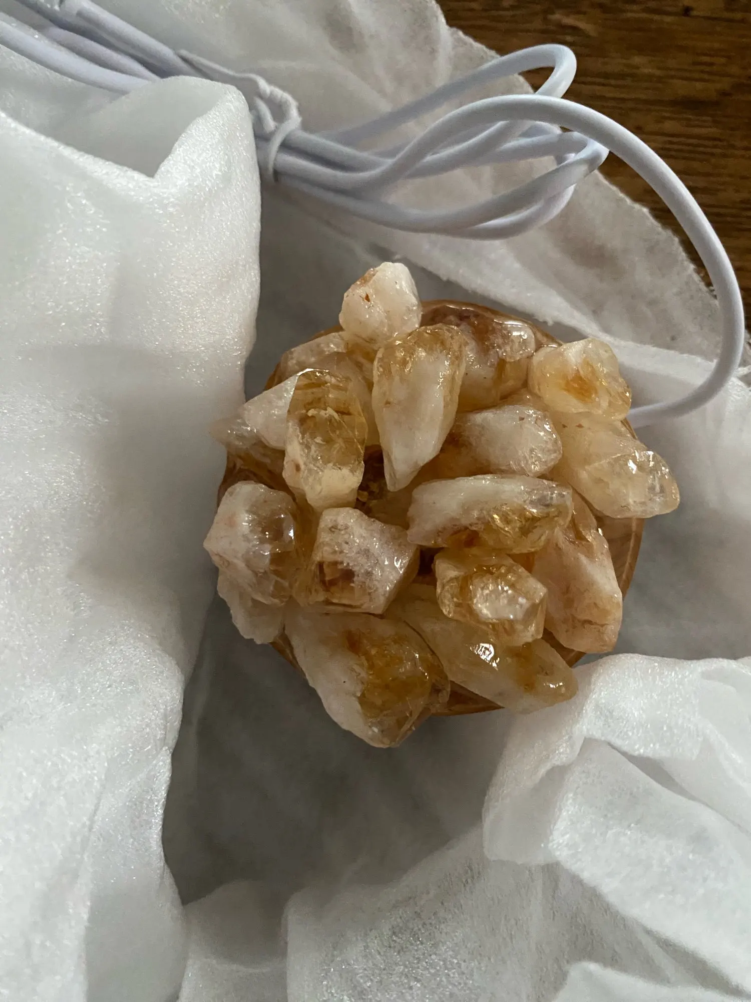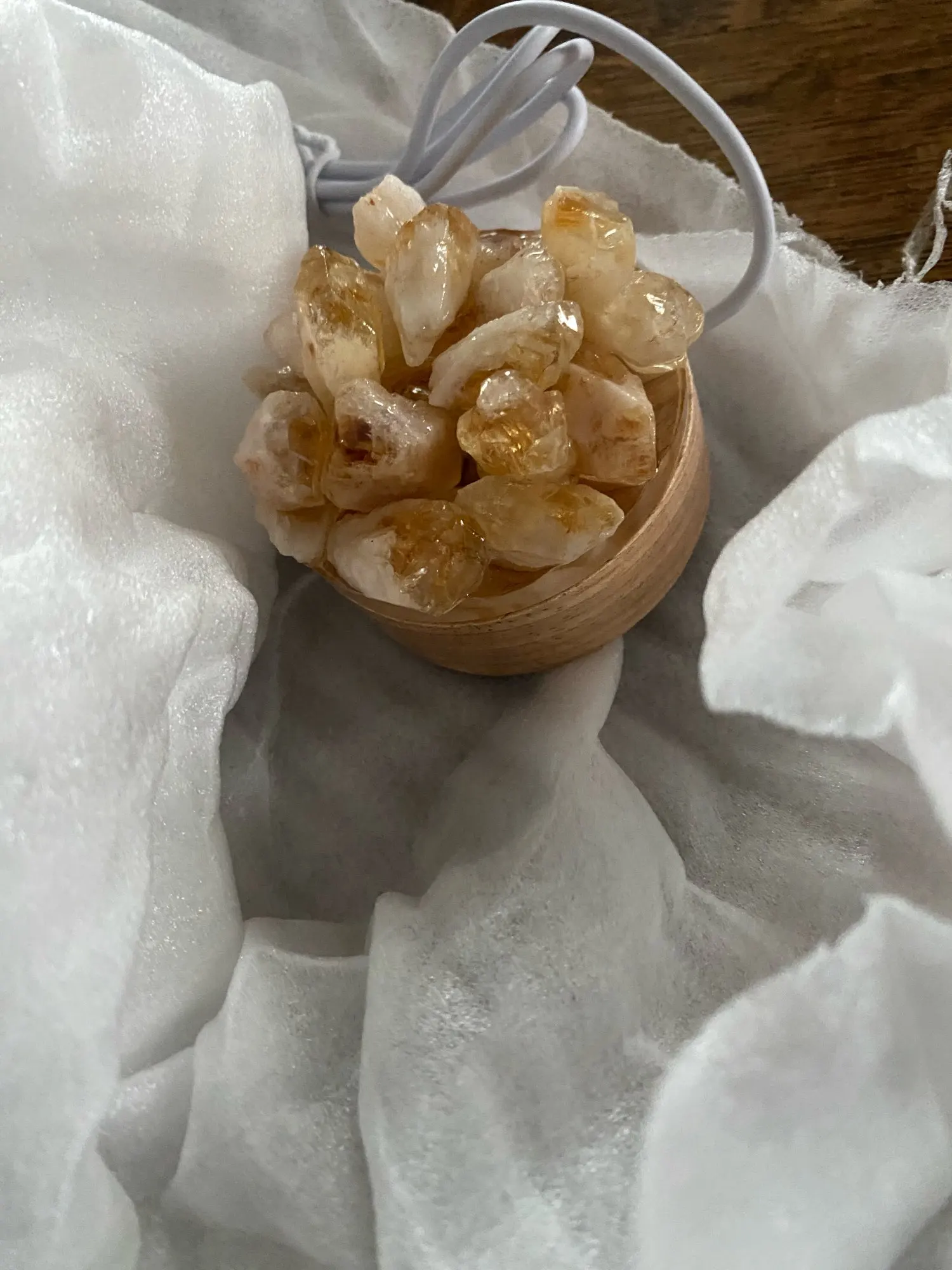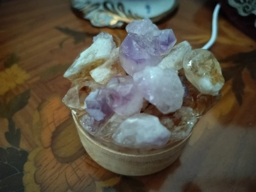 - Material: Natural Crystal Stones + Wooden Base