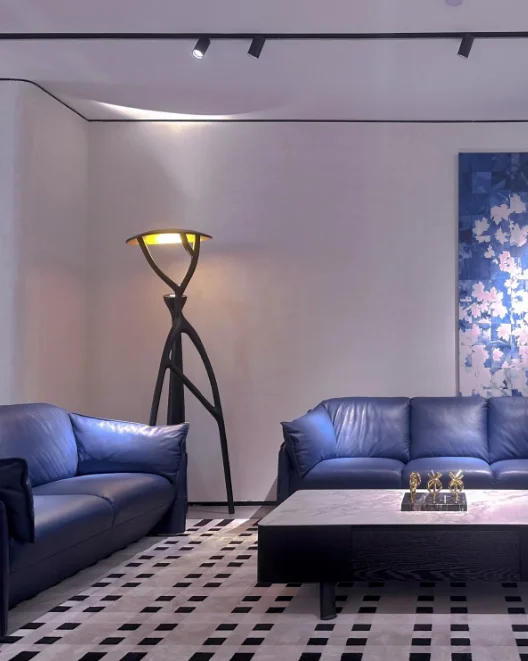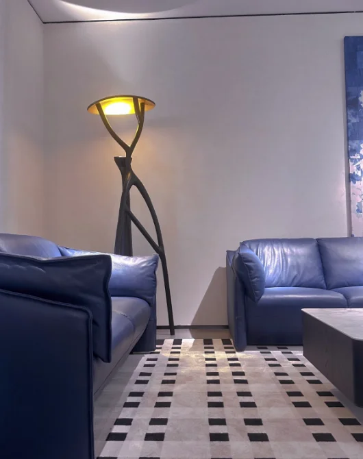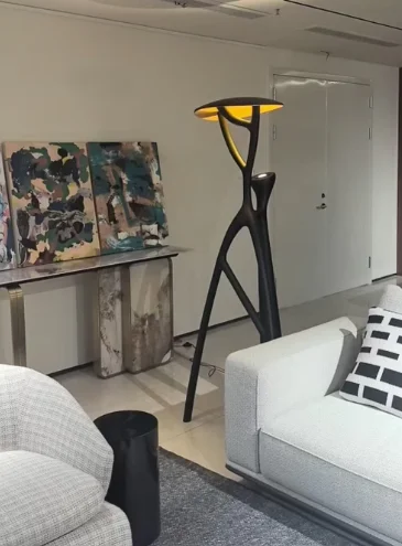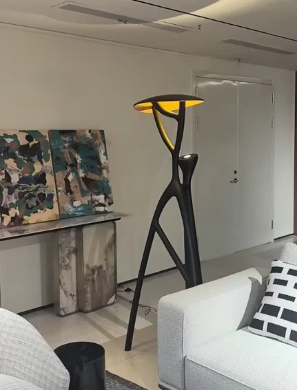 A modern sculptural floor lamp that blends artistic expression with warm, atmospheric lighting.