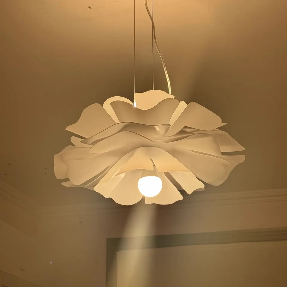 Crafted in layered white acrylic with an integrated LED light source, the Petal Bloom pendant diffuses light evenly, creating a calm and atmospheric glow. Its organic silhouette adds depth and movement, making it ideal for living rooms, dining areas, bedrooms, and boutique spaces.